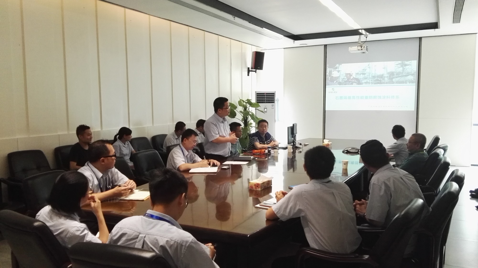? ? 2018年8月1日,廣東好邦石墨烯新材料科技有限公司董事長韓強、總經理姚永健攜技術人員前往順特電氣有限公司就石墨烯防腐涂料進行了第三次技術交流,順特公司供管部、設計部、技術部、工藝部、檢驗部等部門領導參與了交流會。會議主要討論了石墨烯涂料在電氣設備上應用的可行性及優越性,之前順特電氣已對好邦公司的石墨烯涂料進行了一年多的相關試驗測試,驗證了石墨烯涂層配套性能明顯優于傳統